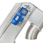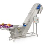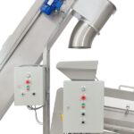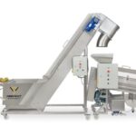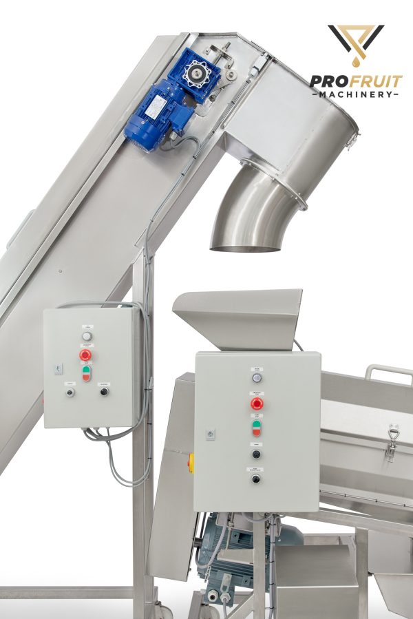 Then conveyor lifts the products up to the outlet which transfers the products to further processing (destoning-pulping or other). During the lifting process, water nozzles spray the fruits and vegetables with clean water.