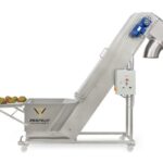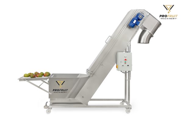 - Integrated water-spraying system provides additional washing when lifting the fruits up the conveyor.