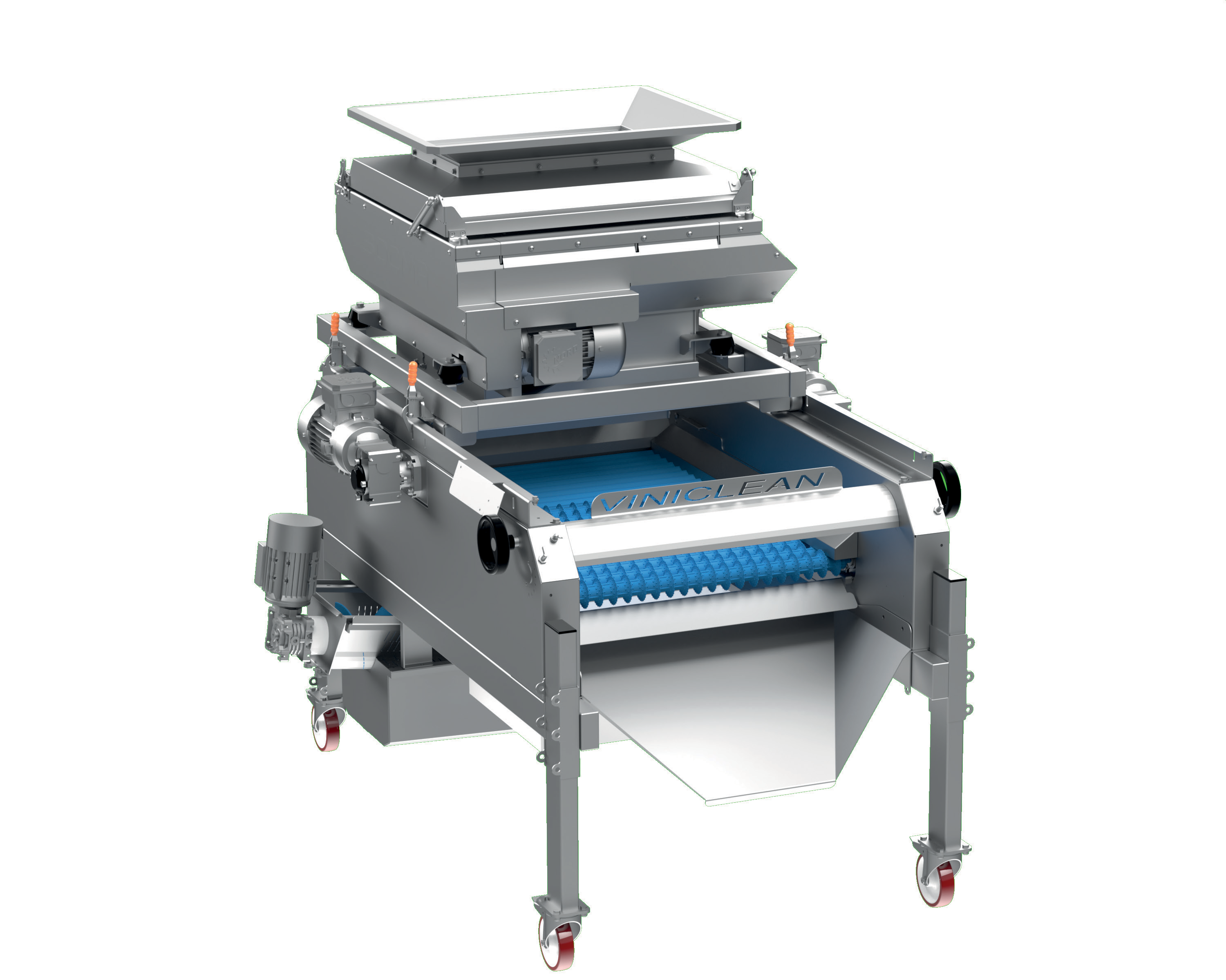 It can be fed by a bin or screw hopper, vibrating bin or hopper, belt or vibrating sorting table, conveyor belt, or by crate, with a manual harvest or mechanical harvest, to destem and sort, or to sort only.
