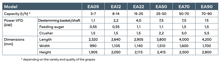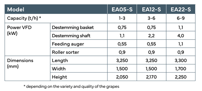 Precisely separately adjustable speeds of the drive motors for the feeding auger, destemming basket, and destemming shaft allow for exact regulation of the destemming process.